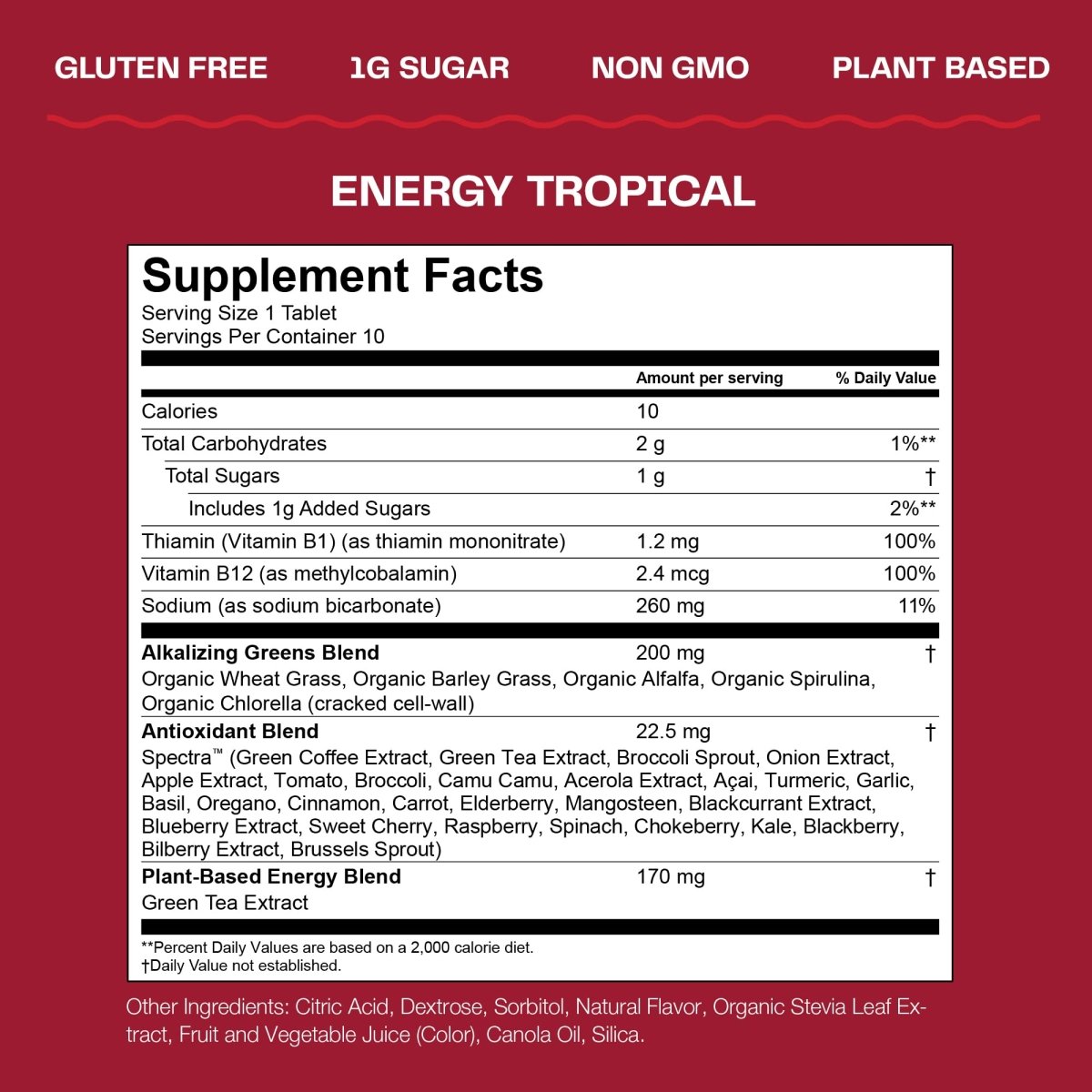 Each tablet is a powerhouse of green nutrition and caffeine from green tea extract, ensuring you feel naturally energized without the jitters. Weâre talking a blend of essential vitamins and minerals, supporting your daily energy in a way that's both joyful and sustainable. Imagine feeling as lively as a parrot in a palm tree!
