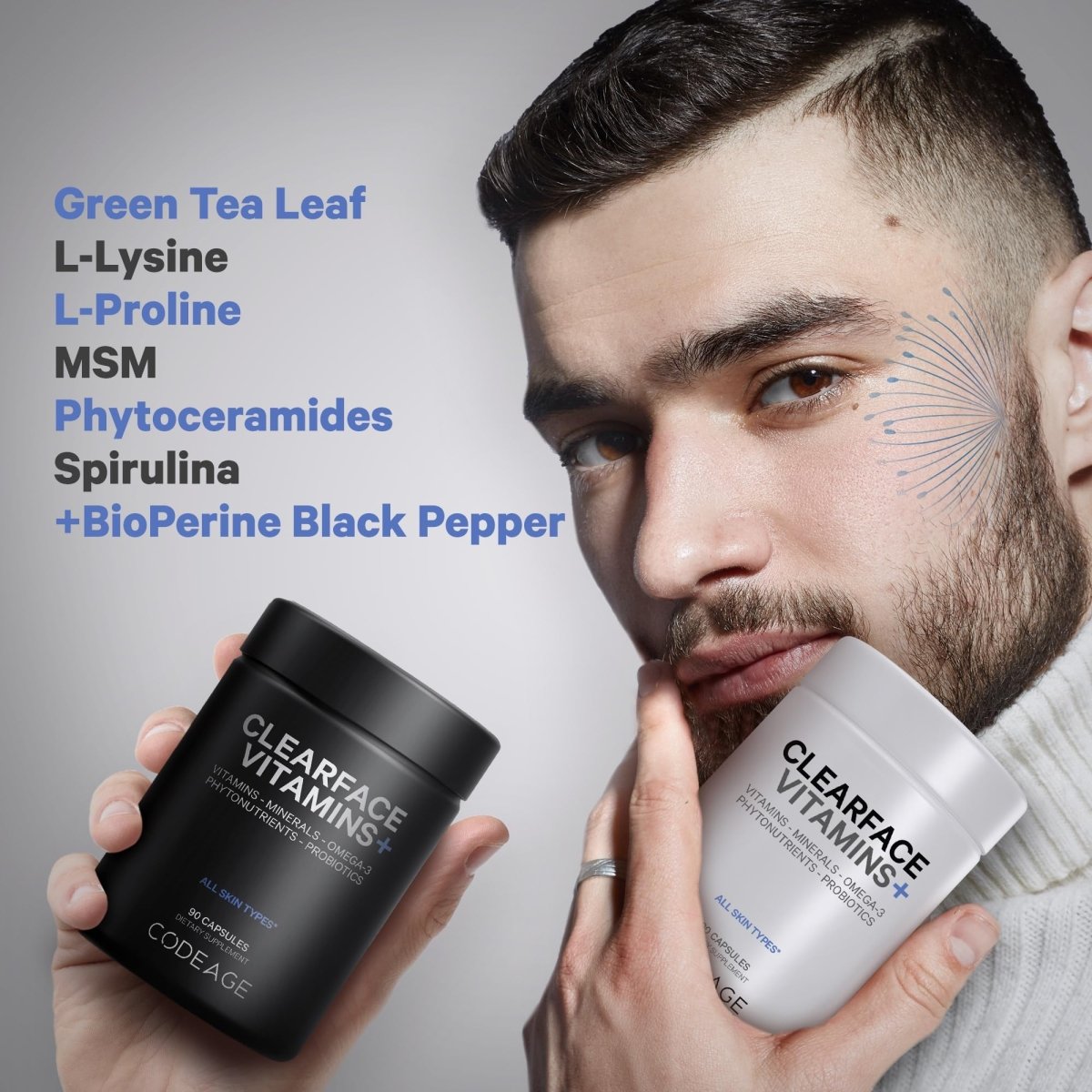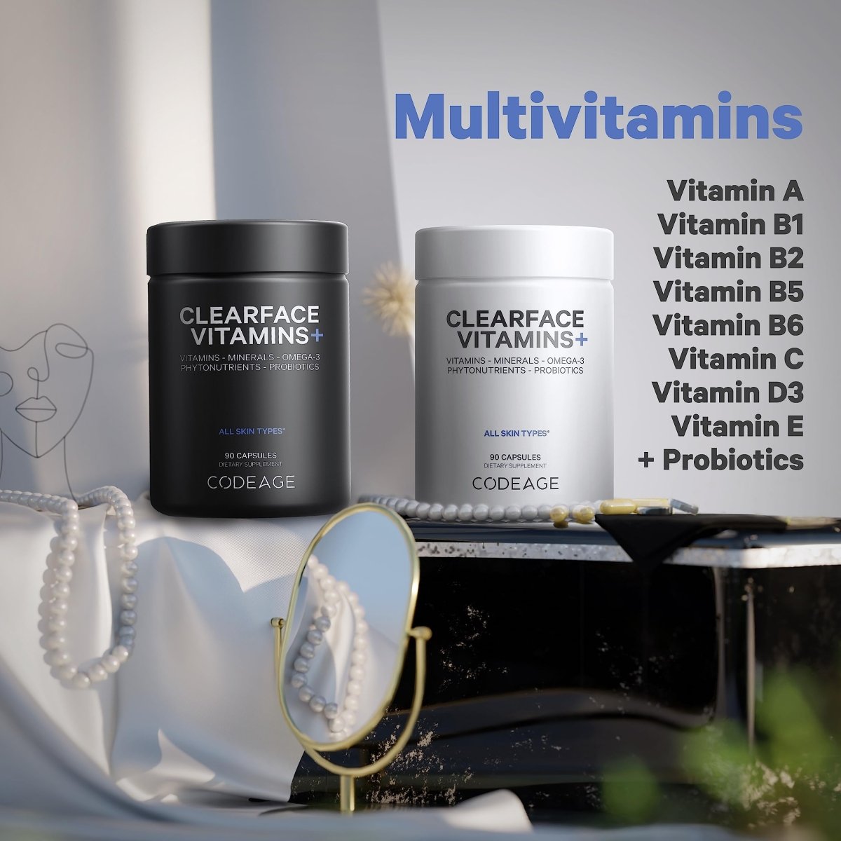 Introducing the ultimate skincare sidekick: Codeage Clearface! This little bottle of magic is packed with more goodness than your grandma's secret cookie recipe. We've got Pantothenic Acid, Niacin, Vitamins A, C, D3, and E all working overtime to keep your skin looking as fresh as a daisy in springtime. And let's not forget the FloraFIT Probiotics, because even your skin needs a little healthy bacteria now and then. It's like a spa day in a capsule, darling!