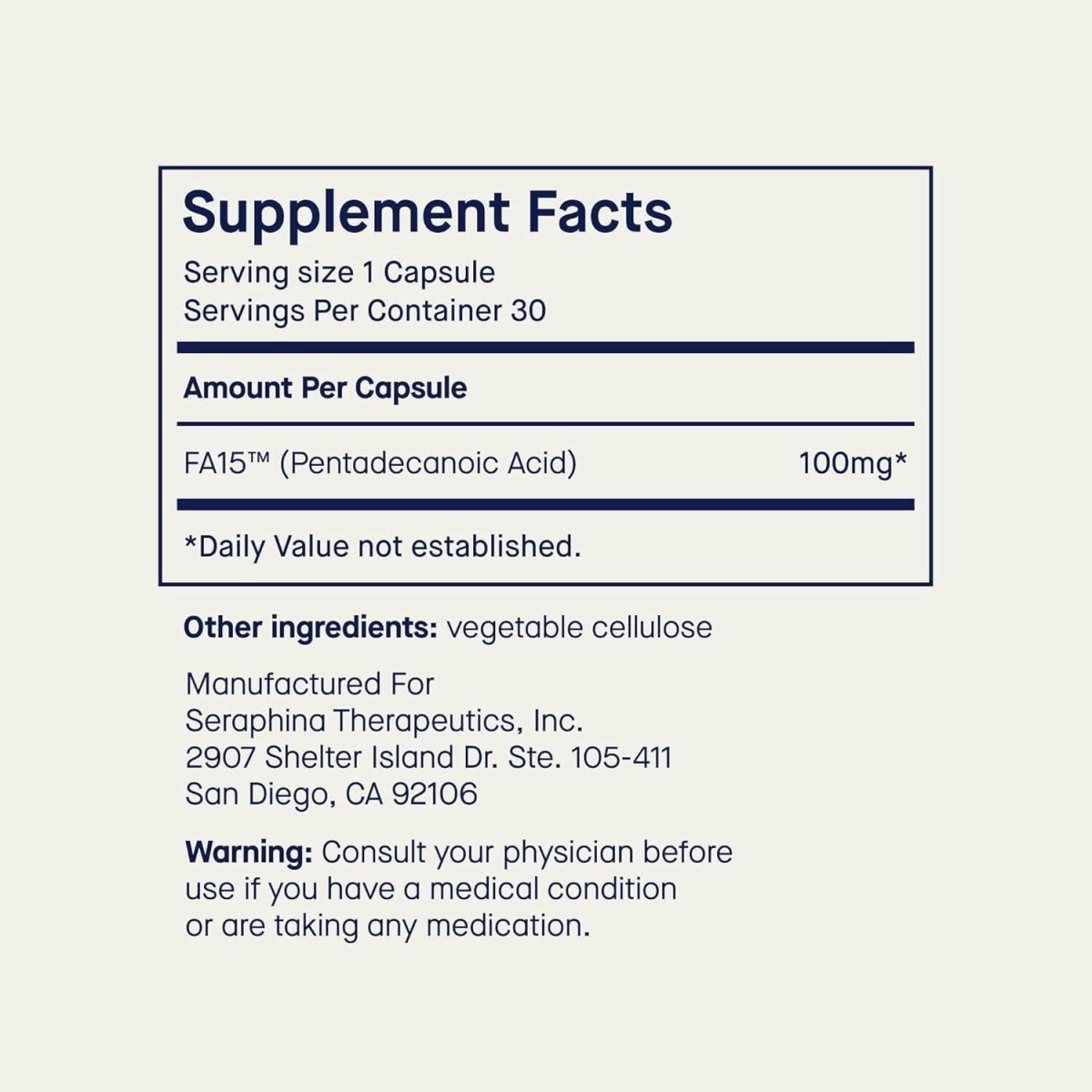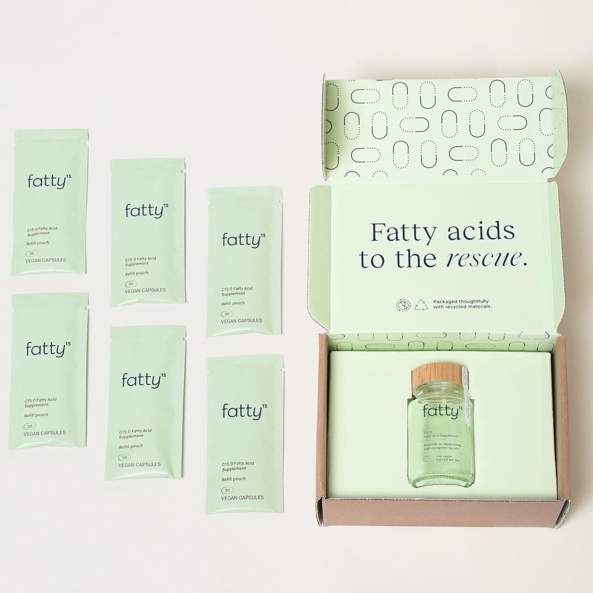 Eco-Friendly Starter Kit with 180-Day Supply - Includes a reusable glass bottle and six 30-count capsule refill packs stored beneath the bottle inside the box. Be sure to lift the tray—your full 180-day supply is tucked underneath. Healthy Aging Fatty Acid Backed by Science - Fatty15 delivers C15:0, a crucial and healthy fatty acid, shown to support long-term cellular strength, health and aging, unlike traditional omega-3 fatty acid supplements. Cellular Metabolism & Longevity Support - Supports mitochondrial function, glucose response, and membrane strength for improved cellular resilience and function. A next-gen replacement of fish oil supplements prone to oxidation and rancidity, omega 3 supplements, CoQ10, and urolithin A supplements. Cognitive Balance & Whole Body Health - Fatty15 improves cellular signaling related to cognitive health, healthy glucose response, liver health, and healthy immune response to promote whole body health & wellness. A powerful complement to DHA, EPA, Alpha-Linolenic Acid, Linoleic Acid, omega 3 supplements and anti-aging routines. Clean, Vegan & Fish-Free Alternative - Made with precision—not from fish, krill, or animal products. A pure, sustainable option for those avoiding fish oil omega 3, krill oil, and omega 3 fatty acid supplements for women and men. These statements have not been evaluated by the Food and Drug Administration. This product is not intended to diagnose, treat, cure, or prevent any disease.