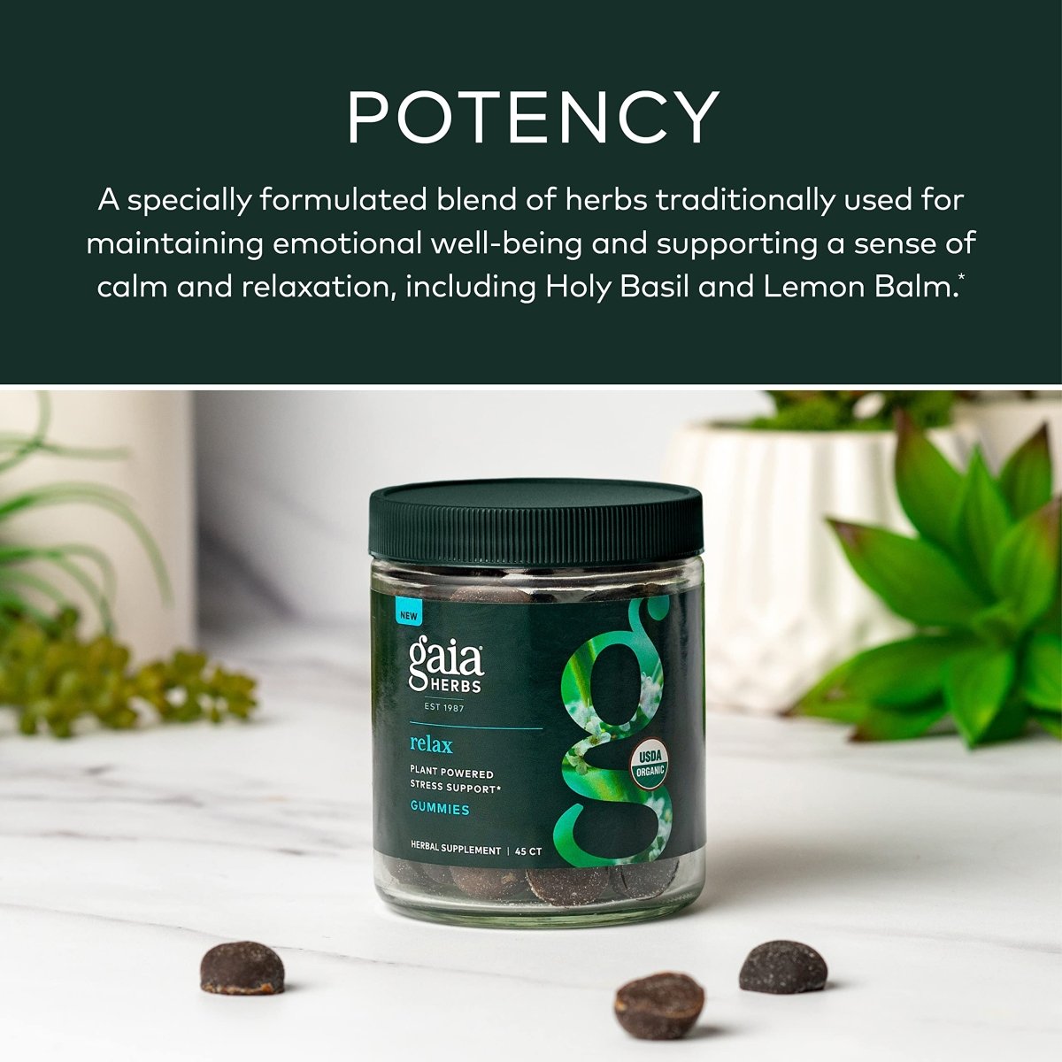 Introducing Gaia Herbs Organic Relax Gummies - your new best friend in the quest for tranquility. When life gives you lemons, make lemonade... or better yet, pop one of these luscious lemon balm-infused gummies! Each delicious bite is a symphony of Holy Basil, Lemon Balm, and Passionflower, harmonizing to soothe your stress and support your serenity. USDA Certified Organic, Non-GMO, Gluten-Free, and Vegan, these gummies are as pure as your intentions to relax. With 45 gummies in each pack, you’ll be saying goodbye to stress and hello to bliss in no time. Because darling, you deserve a break today! ??