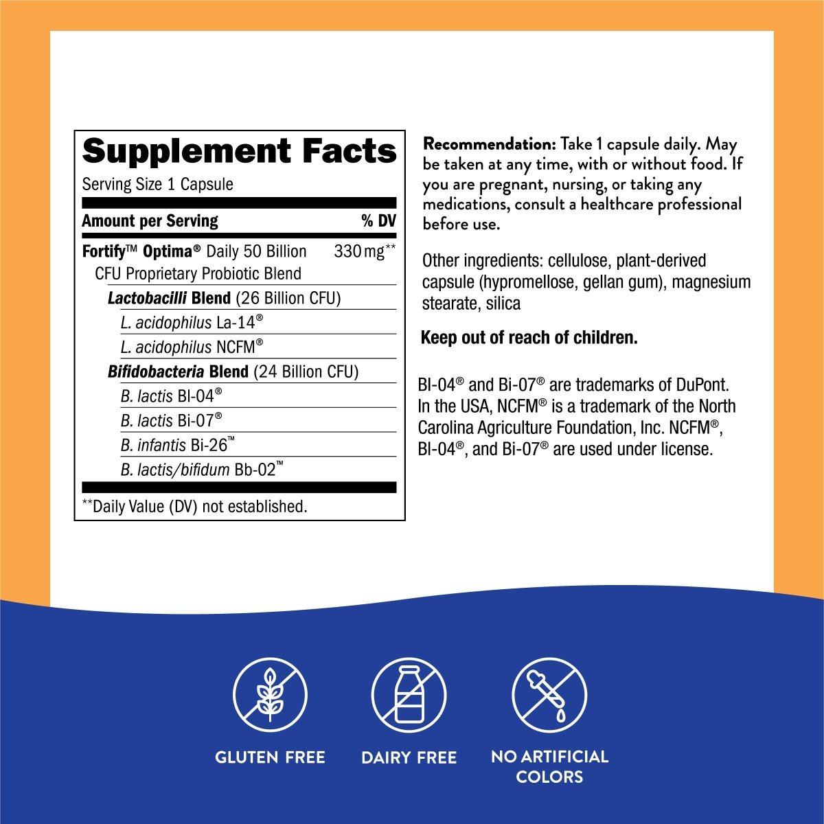 Nature's Way Fortify Optima 50 Billion Daily Probiotic β the probiotic that makes your gut feel like it just won a spa day! Packed with 50 billion live cultures and a harmonious blend of 6 probiotic strains, this little capsule is your digestive system's new BFF. Whether you've overindulged at the buffet or are simply looking for daily support, Fortify Optima is here to keep your tummy and immune system in tip-top shape. Easy to swallow and even easier to love, it's the secret weapon your digestive health has been waiting for. Say goodbye to the bloat and hello to feeling fabulous!