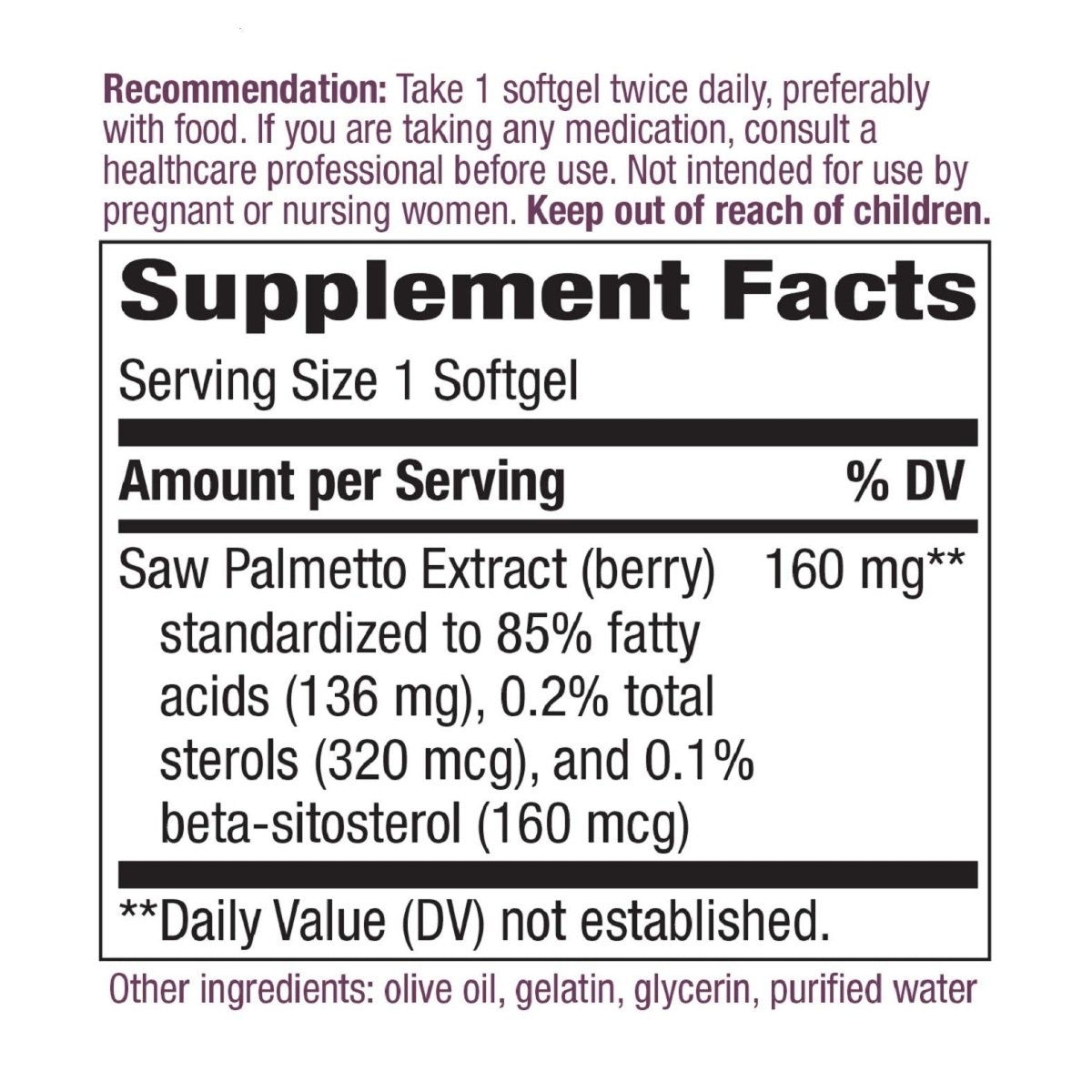 Gentlemen, it's time to give your prostate the VIP treatment it deserves! Introducing Nature's Way Saw Palmetto Standardized Extract, your new best friend in the quest for prostate health. Each serving packs a punch with 160 mg of premium saw palmetto extract, meticulously standardized to ensure you get the highest quality support.