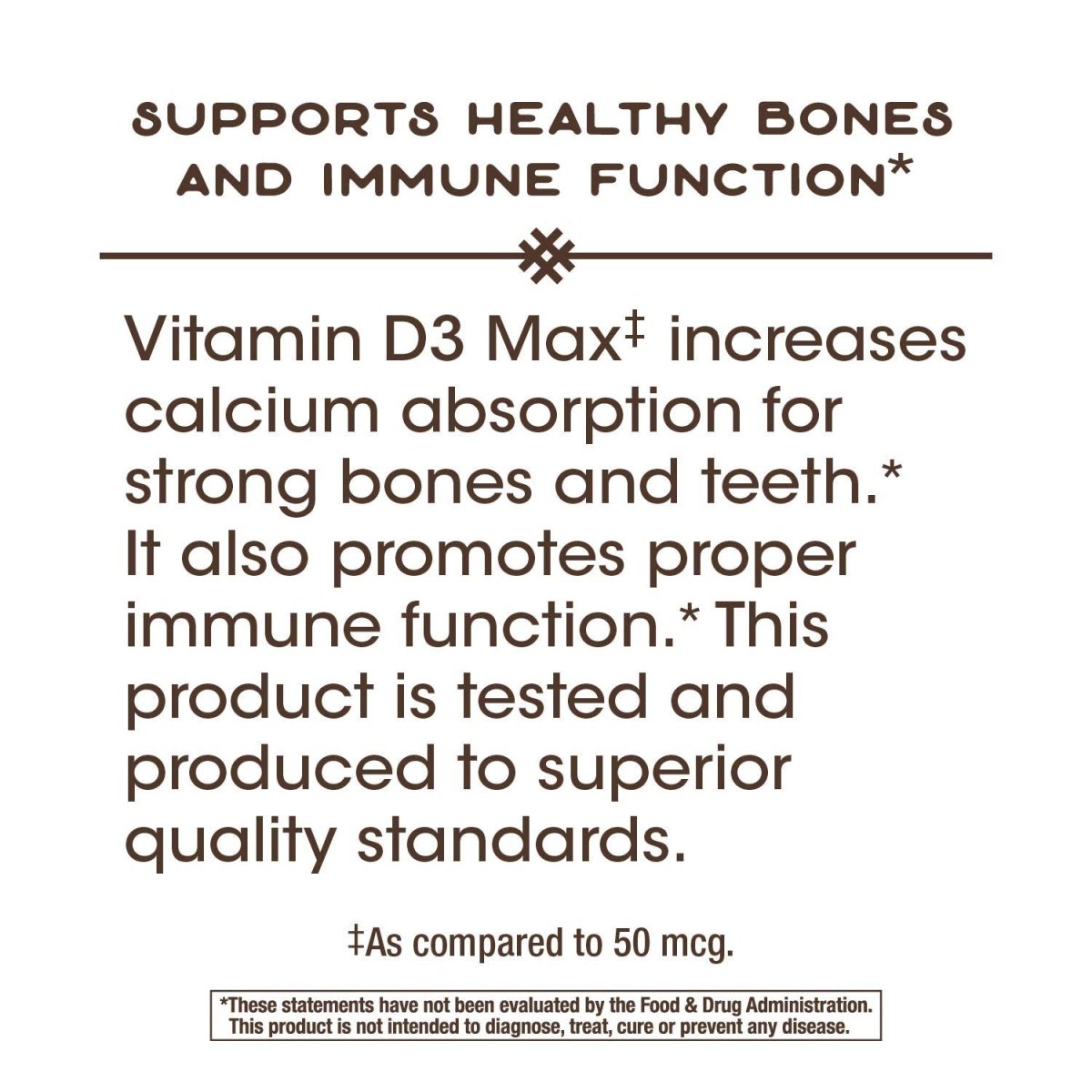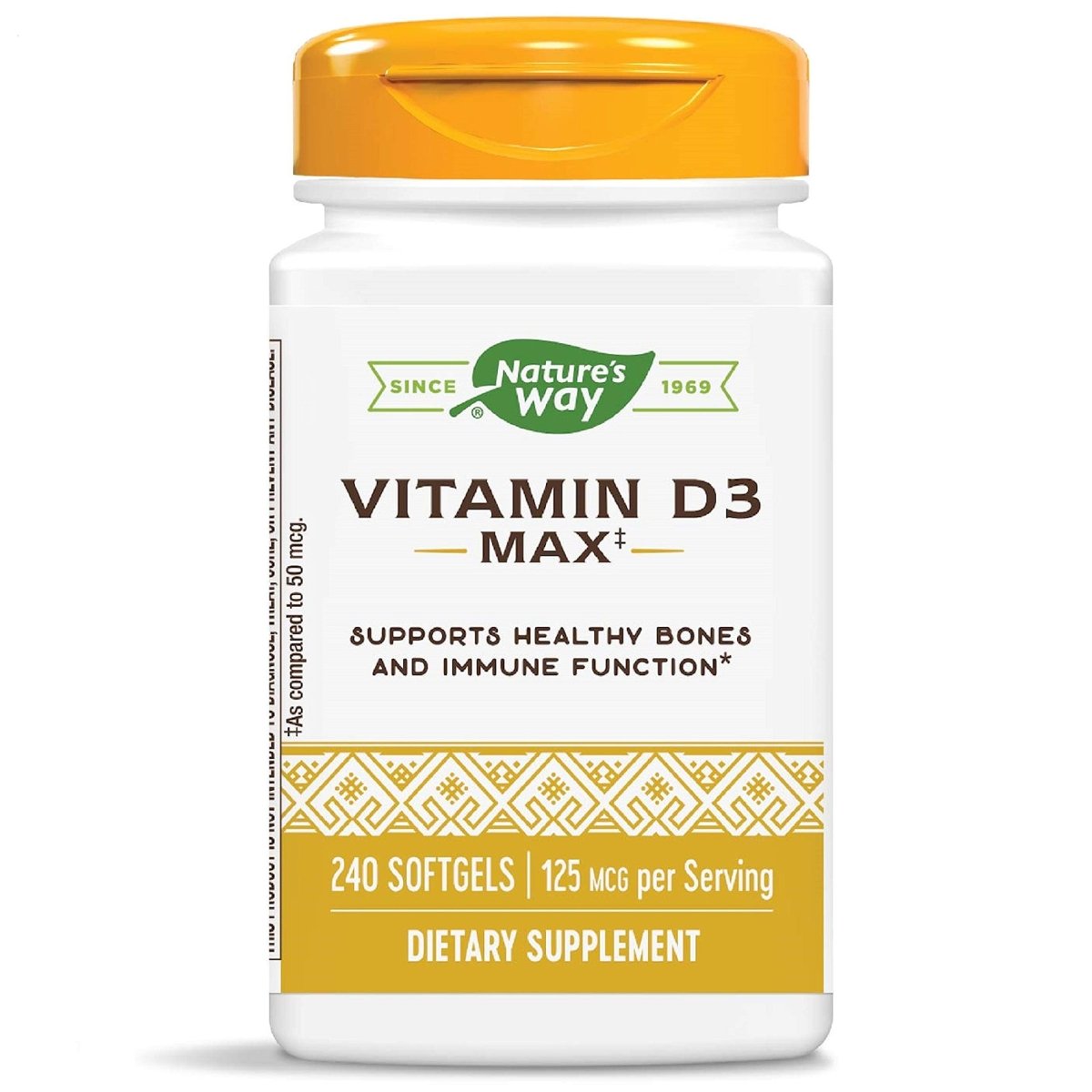 Nature's Way Vitamin D3 Max – because who doesn't want bones as strong as steel beams and an immune system that could rival a superhero's? This isn't just any vitamin D3; it's the crème de la crème, the pièce de résistance of supplements. Each serving packs a powerful 125 mcg punch of Vitamin D3, expertly crafted to support those bones and teeth you've been using since your first bite of cereal. And let's not forget about your immune health – because nobody has time for sick days when there are brunches to attend and yoga classes to conquer. With 240 softgels in each bottle, you'll be ready to face whatever the world throws your way. So go ahead, strut your stuff with confidence, knowing you're fortified from the inside out. Remember, even superheroes need a little support sometimes.