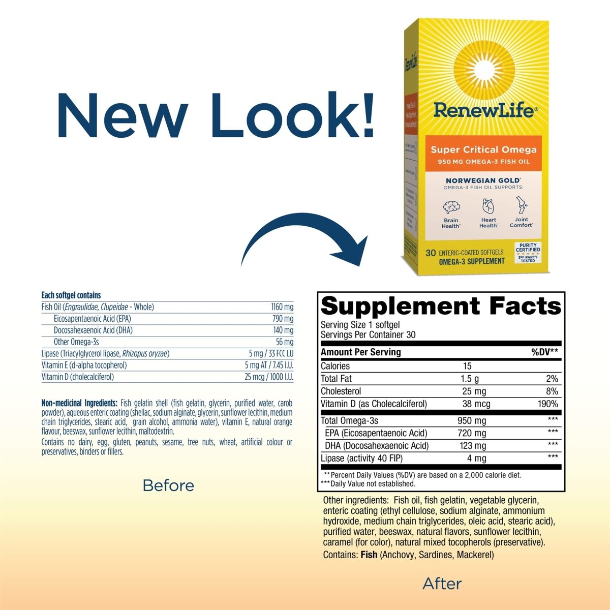 Introducing Renew Life Fish Oil, Norwegian Gold Omega-3 Supplement, the ultimate catch for your health! With a potent 950mg of critical Omega-3s per serving, these soft gel capsules are the perfect fishing expedition for supporting a healthy heart and brain function. Say goodbye to those dreaded fishy burps with our advanced burp-free formula. Whether you're on a dairy or gluten-free diet, we've got you covered. Each bottle contains 30 soft gel capsules, offering a month's supply of pure, unadulterated wellness straight from the pristine waters of Norway. Cast your line for a healthier you today!