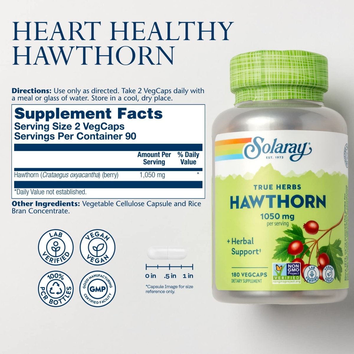 Introducing the SOLARAY Hawthorn Berry 525mg, your heart's new best friend! This isn't just any berry; it's the whole enchilada—packed with all the goodness Mother Nature intended. Each vegan capsule is a powerhouse, crafted to support healthy cardiovascular function and promote normal, healthy circulation. With 180 capsules in each bottle, you'll be set to keep your ticker in tip-top shape. And because we know you care, this product is Non-GMO, meaning it's as pure as your intentions. So why wait? Give your heart the love it deserves with SOLARAY Hawthorn Berry!