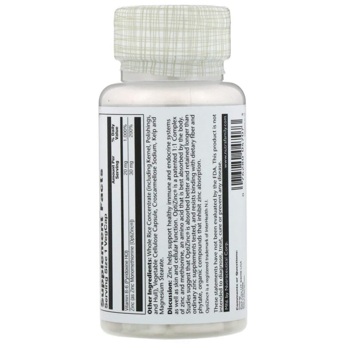Solaray OptiZinc 30mg - 60 VegCaps: A blend of sophistication and science, this zinc supplement is the epitome of health support. Each bottle contains 60 vegetarian capsules, providing a potent 30mg of zinc per serving. OptiZinc is a unique, patented form of zinc, bound with the amino acid methionine to enhance absorption and utilization. It's like giving your immune system a first-class ticket to wellness! Ideal for those who want to maintain healthy skin, support their immune function, and ensure their body is performing at its best. With Solaray OptiZinc, you're not just taking a supplement; you're investing in your health with a brand that's been trusted for over 45 years.