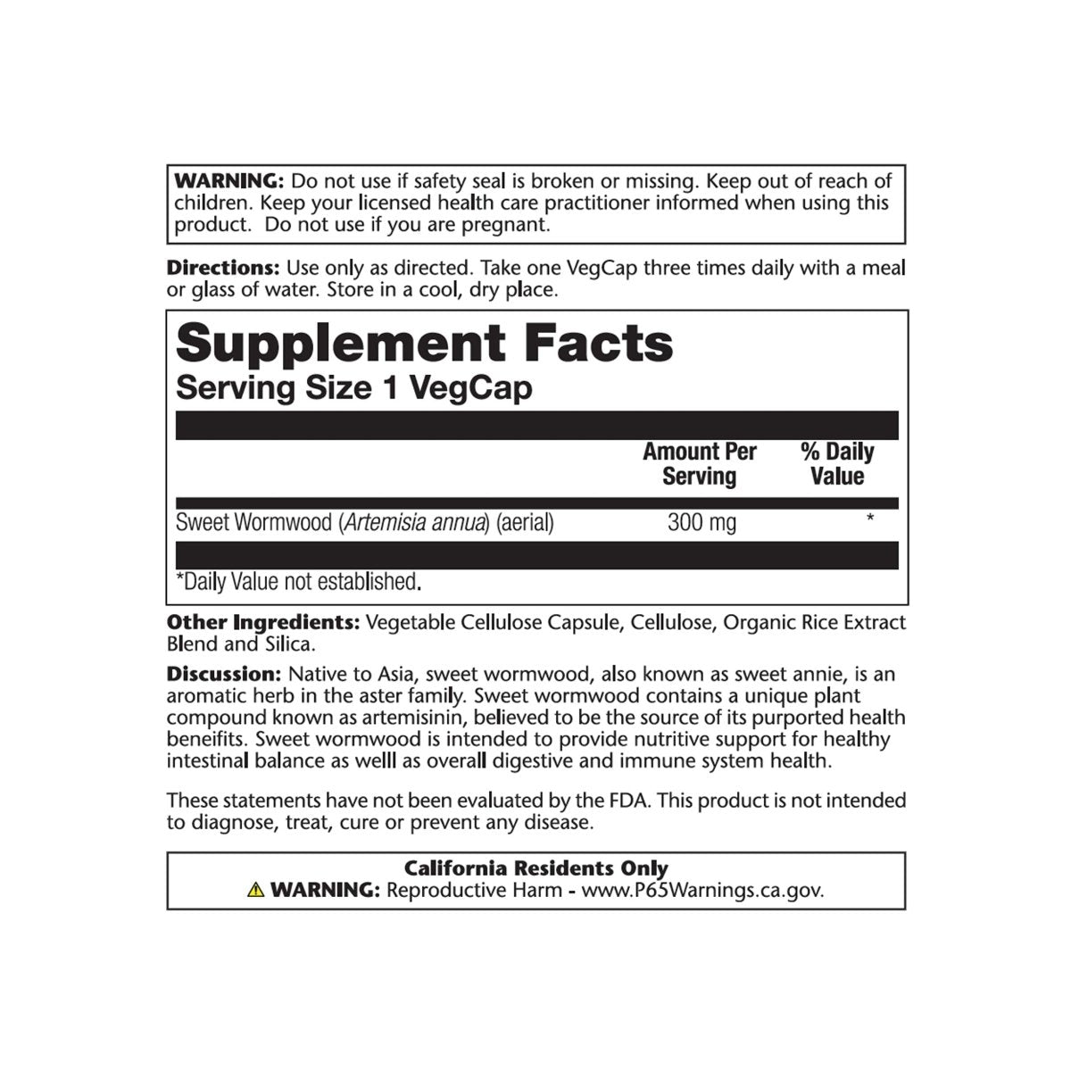 Solaray Sweet Wormwood Aerial, Veg Cap (Btl-Plastic) 300mg 100ct