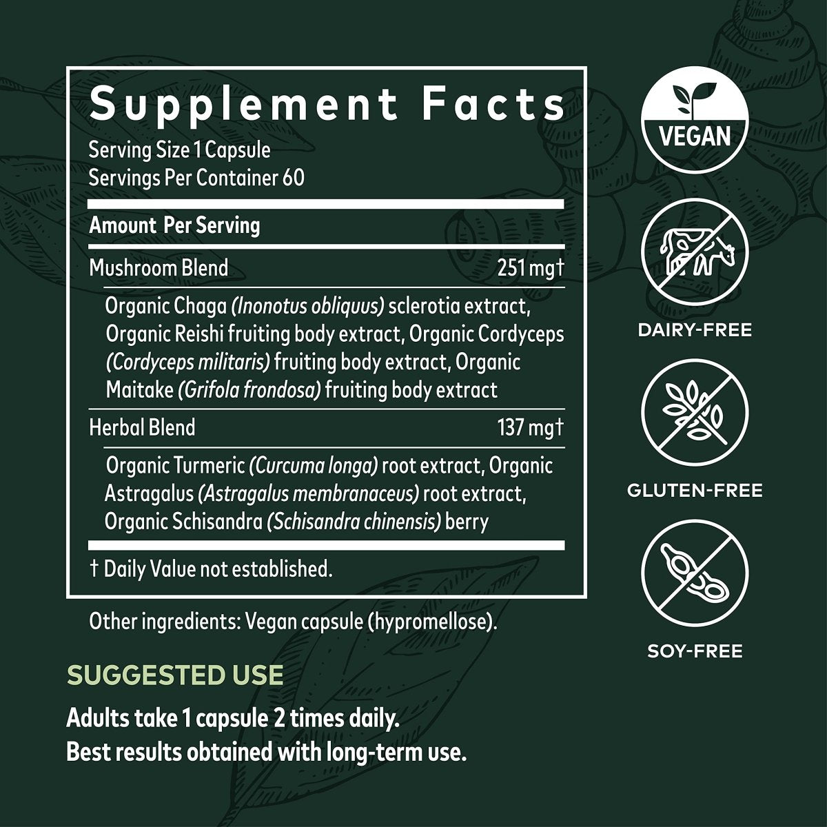 ? Key Ingredients: Dive into the bold flavors of Turmeric Curcumin, Astragalus, Cordyceps, and Chaga Mushrooms. Each capsule is a little powerhouse packed with nature's best, designed to support your overall wellness in a way that even Mother Nature would approve.