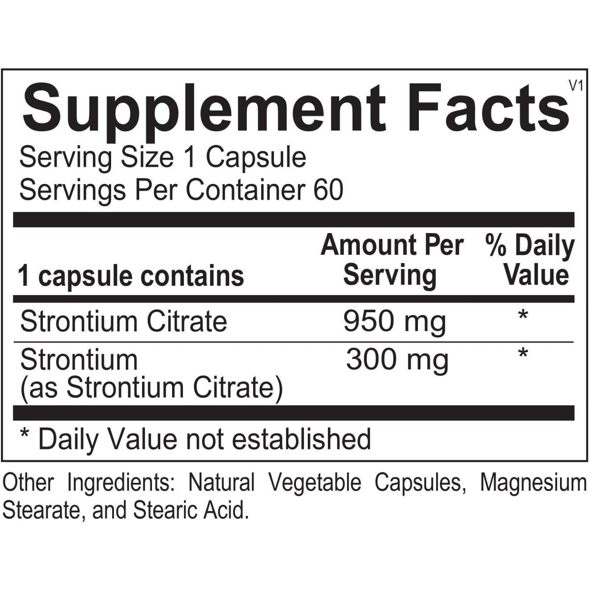 Each capsule is a commitment to quality, crafted with precision to deliver strontium of the highest purity. Whether you're looking to promote overall skeletal structure or simply maintain it, these capsules are your daily armor.