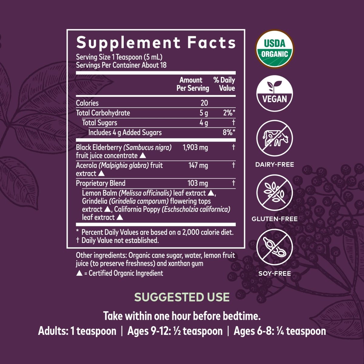 Gaia Herbs Black Elderberry Nighttime Syrup - When the Sandman is on vacation, let this syrup tuck you in with a lullaby of immune support and restful sleep. Packed with organic black elderberries, California poppy, and lemon balm, it’s like a bedtime story for your immune system. So, snuggle up, relax, and let nature’s finest ingredients cradle you into dreamland. Sweet dreams and even sweeter immune defense await in each 5.4 fl oz bottle, designed to last you a cozy 32 nights.